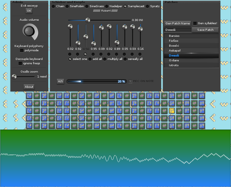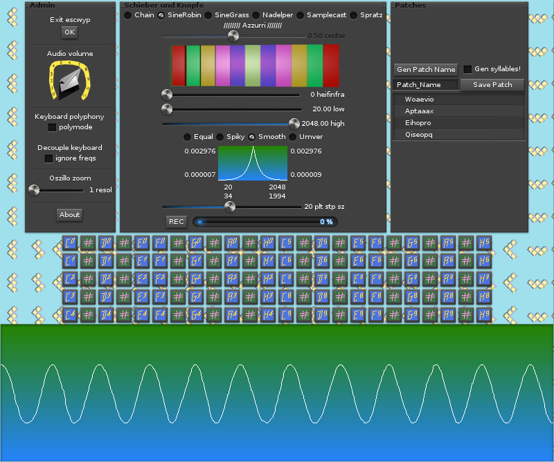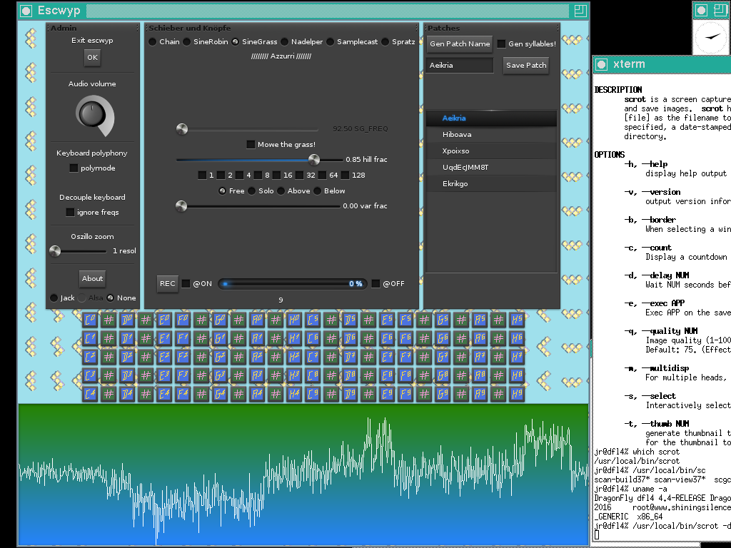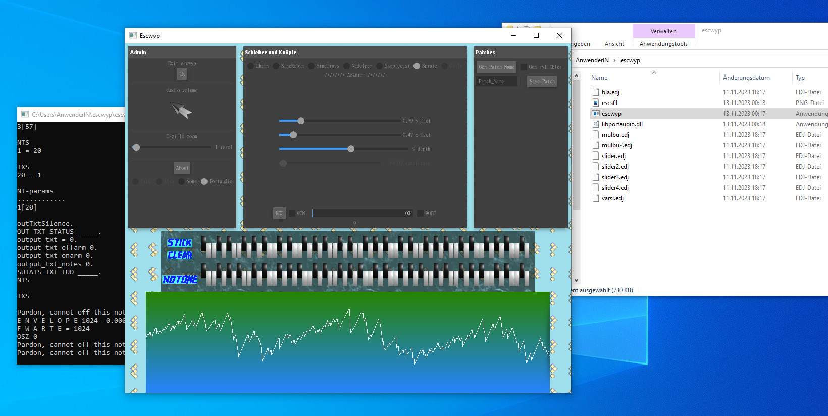 | 13.11.2023 Here is an experimental version for Windows. He. escwyp_win64.zip (1.4 MB) for the interested. Heck. You will need to install the following from https://github.com/vtorri/ewpi/releases : ewpi-x86_64-win10-1.1.exe efl-x86_64-win10-1.26.exe and then unpack the above zip-File change into the folder escwyp_win64 and from there run escwyp.exe It basically works but not all features are testet or expected to work fine :) but hey! Thanks to vtorri for making EFL work on Windows ;) Sounds good. It uses Portaudio so a libportaudio.dll is also provided. It even works in Wine (but you need a CPU capable of AVX). | ![]() |